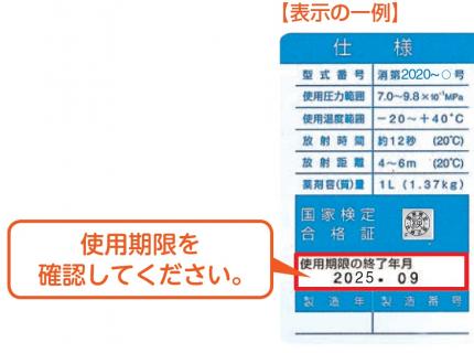 住宅用消火器にも寿命があり、使用期間又は使用期限が本体に表示されています。 また、薬剤の詰め替えができない構造となっています。 ご家庭にある住宅用消火器の期限等を確認して、期限を過ぎたものは、新しいものと交換してください。 |
